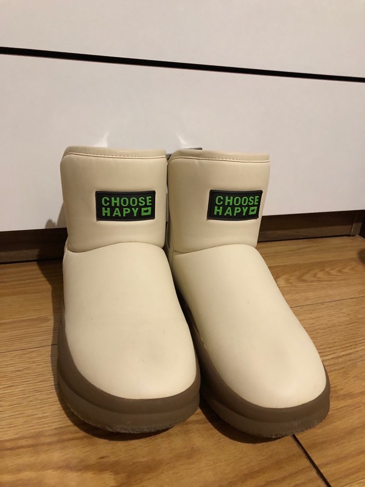 Beyaz kauçuk botlar, platform topuk ve 'CHOOSE HAPY' yazılı baskılı etikete sahiptir. Günlük kullanıma uygun, rahat ve trend görünümlü sokak stili botlar. Sadece 1 kez kullanıldı ☁️