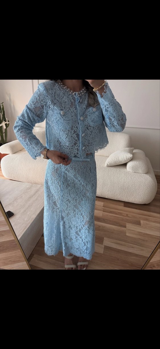 Pastel mavi tonlarında, nakış detaylı alt üst takım . Düğmeli, yakası kesik ve uzun kollu, uygun rahat kesim. Trendy ve şık bir model. S/M uyumlu • İthal Takım •