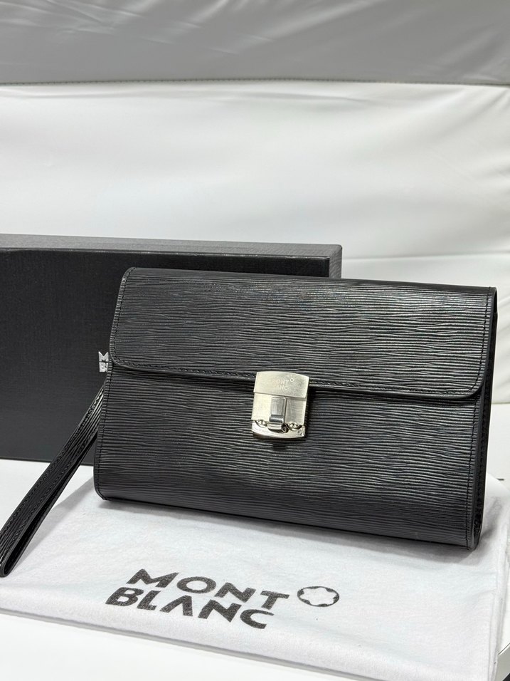 Montblanc siyah deri tokalı portföy çanta, modern klasik tarzda, ofis kullanımı için uygun, düz dokulu ve bilek askılı.