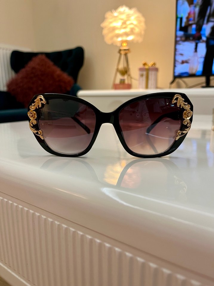 İthal Orjinal Özel Tasarım Altın detaylarla Gül desenleri muhteşem şık bir Güneş Gözlüğü’ En son fotoğraftaki gibi kılıfı ve temizleme mendili ile gönderilecektir. detaylı ve klasik got tarzında kadın güneş gözlüğü. Çerçevede köşelerde zarif altın süslemeler bulunur. Köyü kahverengi dış kısmı siyah gibi de duruyor cam renkleri kahverengi.