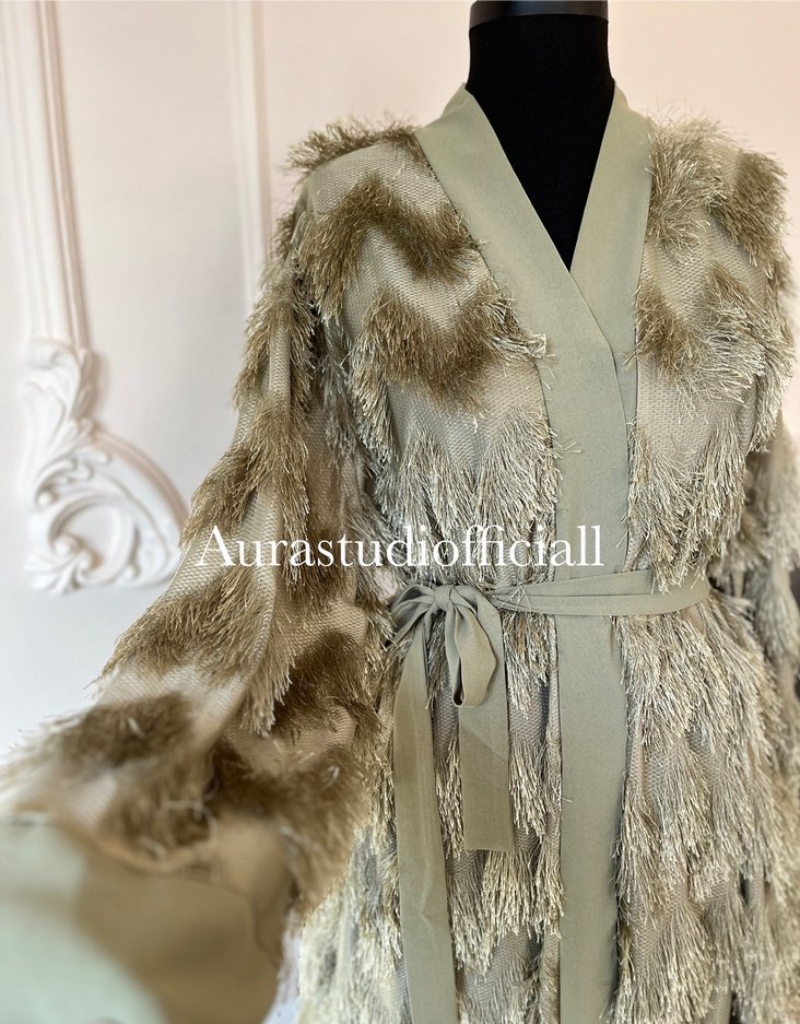 Ölçüleri: Boyu:140 cm en:60 cm kol boyu:62 cm Standart beden: 36-44 Kumaşı:Kendinden püsküllü kumaş.Şifon detaylı Not: İç göstermez