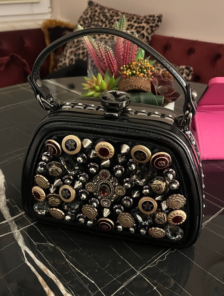 Siyah deri, düğmeli vintage desenli detaylara sahip çanta, romantik gece için gotik ve bohem tarz sunar. Hiç kullanılmadı.