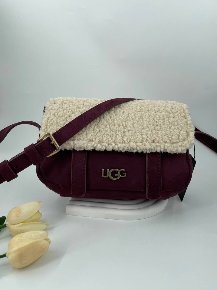 UGG kadın çantası, bordo gövde ve krem rengi yumuşak kürk kapak ile kemerli tasarıma sahiptir, günlük sokak modasına uygundur.