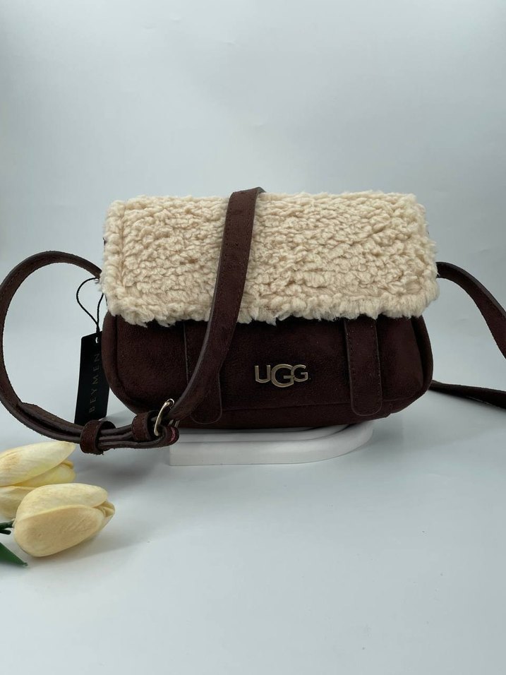 UGG markalı bu kadın çantası, kahverengi süet ve krem rengi yumuşak tüy detayına sahiptir. Kemerli tasarımı ve çapraz askısı ile günlük sokak stiline uygundur.