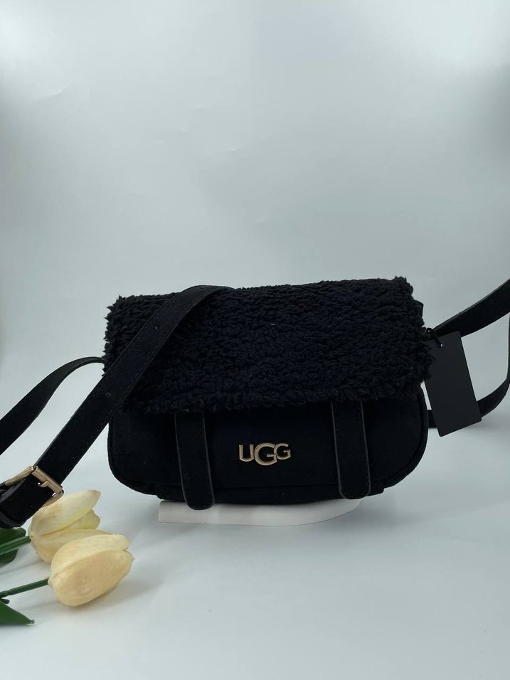 Siyah renkli, yumuşak ve sıcak dokulu UGG kadın omuz çantası, kemerli tasarımıyla trendy günlük rahat stil için uygun.