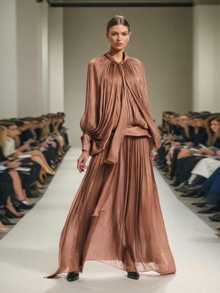 Bej renkli uzun elbise, drapeli tasarımı, yüksek yakası ve uzun kollu yapısıyla dikkat çekiyor. İpek gibi parlak kumaştan, bol kesim ve çağdaş tarzda, düğünler için uygun.