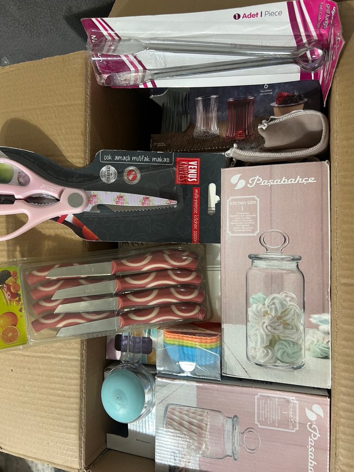 Evidea sofra bezi Yağlı fırın kağıdı Kurulama matı bulaşık makinesi örtüsü Çift cidarlı kahve yanı sunumluk Mikrofiber kurulama bezi Cam kesme tahtası 5 li mutfak bezi Paşabahçe kavanoz Ev terliği krem Cam pipet temizleyici Madame coco hurç Tuzluk Minik tatlı çatalı Havlu 2 adet nevresim riva marka Rende içinde 2 havlu Kahve altlığı Patates dilimleyici Kalpli tahta kaşığı Sütlük Ahşap tahta kaşık koyma Fotoğraf çerçevesi Baharatlık altlığı Bulaşık deterjanlığı Kirazlı ve çilekli eşofman altı English home kurulama bezleri El havlusu Mutfak makası Vücut havlusu English home peçete Silikon kaşık Salata servis kaşığı Ve bir kaç parça daha eşyalar vardır. Çok küçücükken almıştım tarzıma uymayanları elden çıkartıyorum.