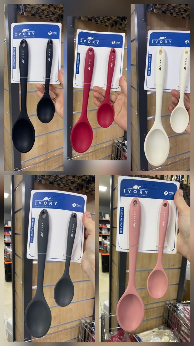 Ivory markalı, siyah, kırmızı, krem, gri ve pembe gibi koyu renklerde iki boy mutfak kaşığı seti.