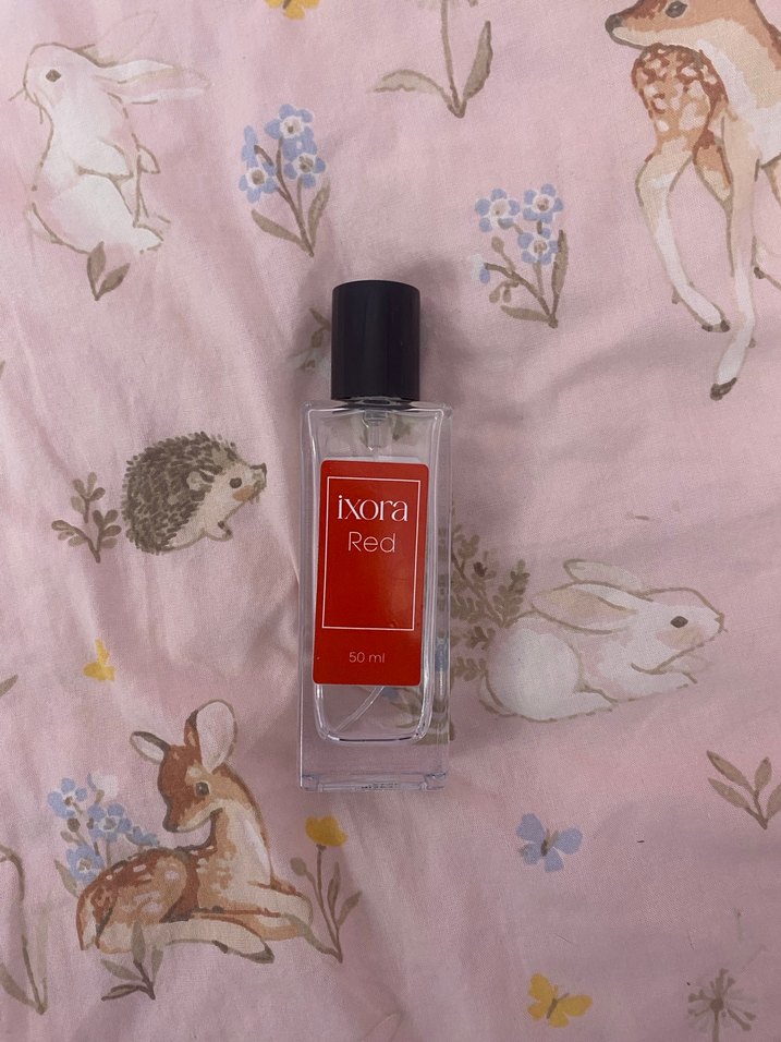 Ixora Red kadın parfümü, 50 ml şişede, kırmızı etiketli ve siyah kapaklı klasik tasarıma sahiptir.