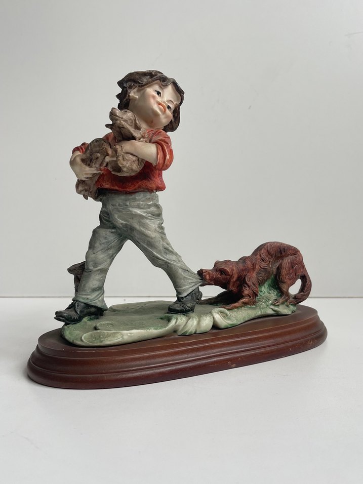 Giuseppe Armani imzalı, İtalya’da üretilmiş, köpekli çocuk figürü (Gulliver’in Dünyası temalı).