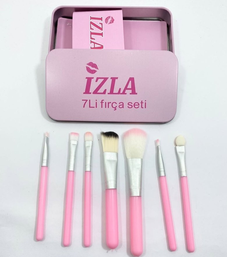 Izla 7'li makyaj fırçası seti, farklı boyutlarda ve şekillerde açık pembe fırçalardan oluşur. Metal kutusunda saklanır.