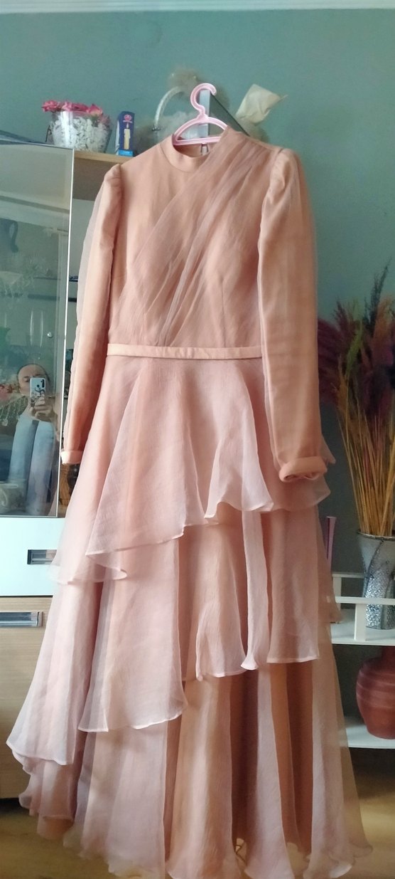 , drapeli uzun kollu ve yüksek yakalı kadın abiye elbise. Gevşek kesim ve uzun boy, düğün için uygun, yumuşak kumaştan yapılmış pastel tonlarda modern klasik tarzda.Boyu 140cm iki kol arası 48 cm bir kere giyildi şali ile vericem