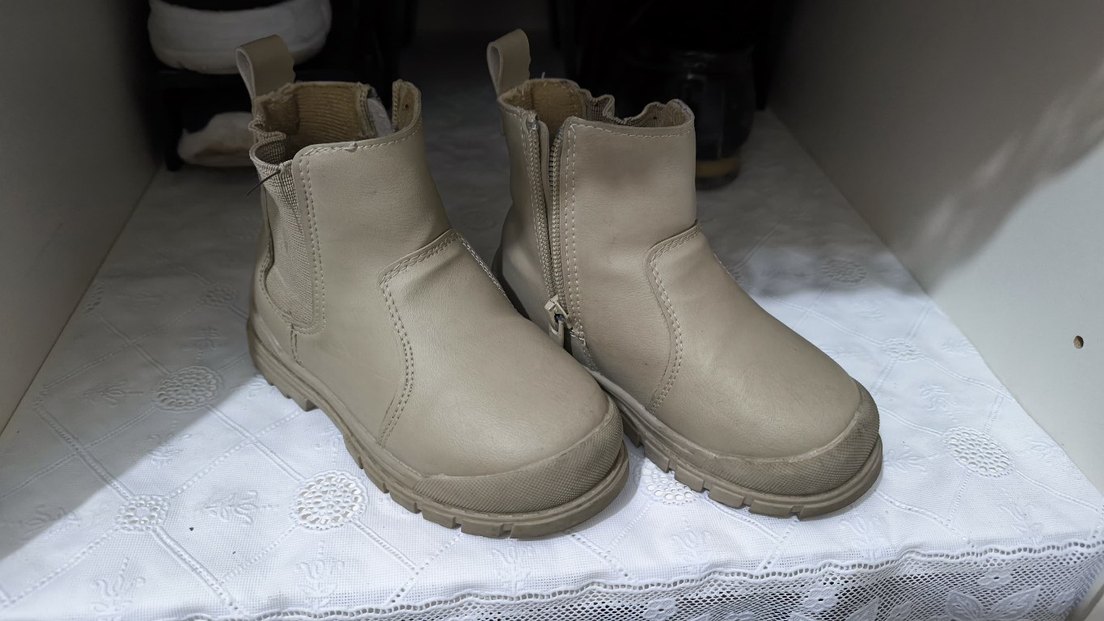 Fermuarlı kapanışa sahip, dayanıklı kauçuk malzemeden üretilmiş bej renkli çocuk botu.