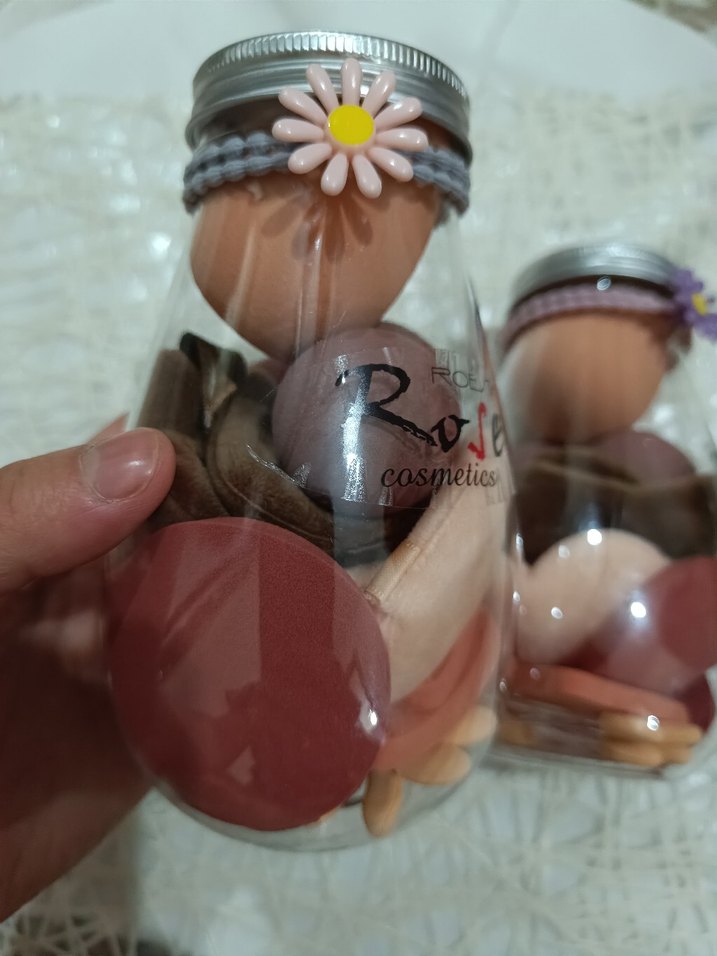çeşitli şekillerde makyaj süngerleri, şeffaf kavanoz içinde çiçekli bantla paketlenmiştir. Yumuşak dokuludur.