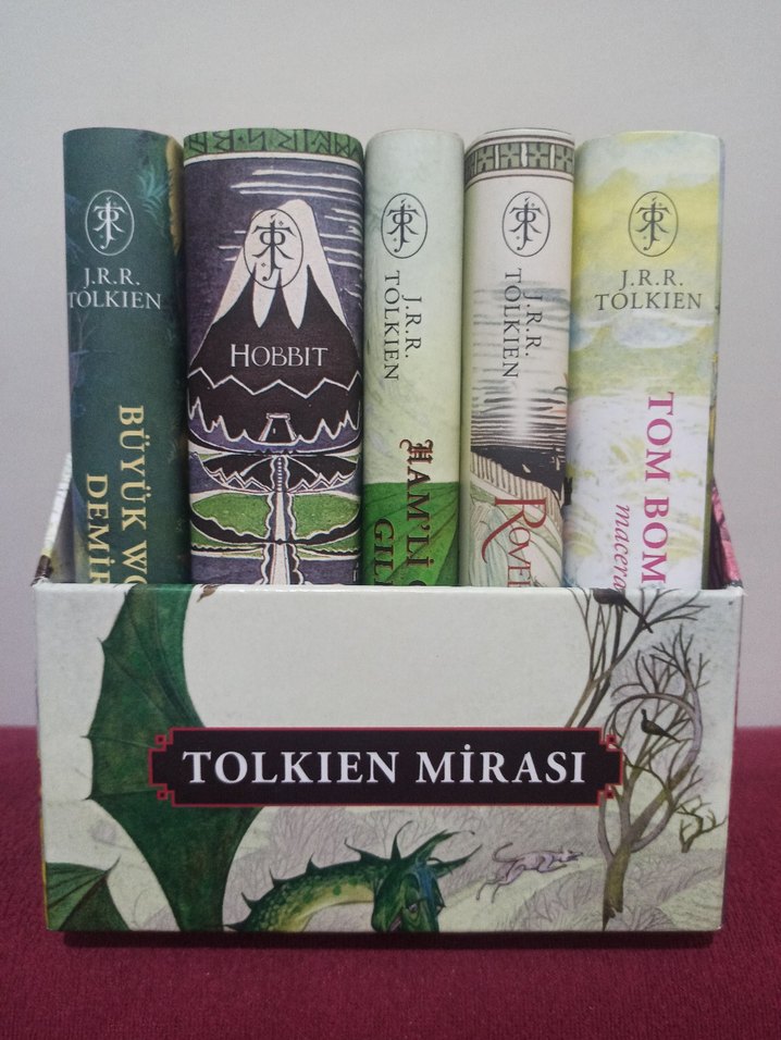 J.R.R. Tolkien'e ait roman seti, dekoratif kutuda şık kapaklı kitaplar içerir.
