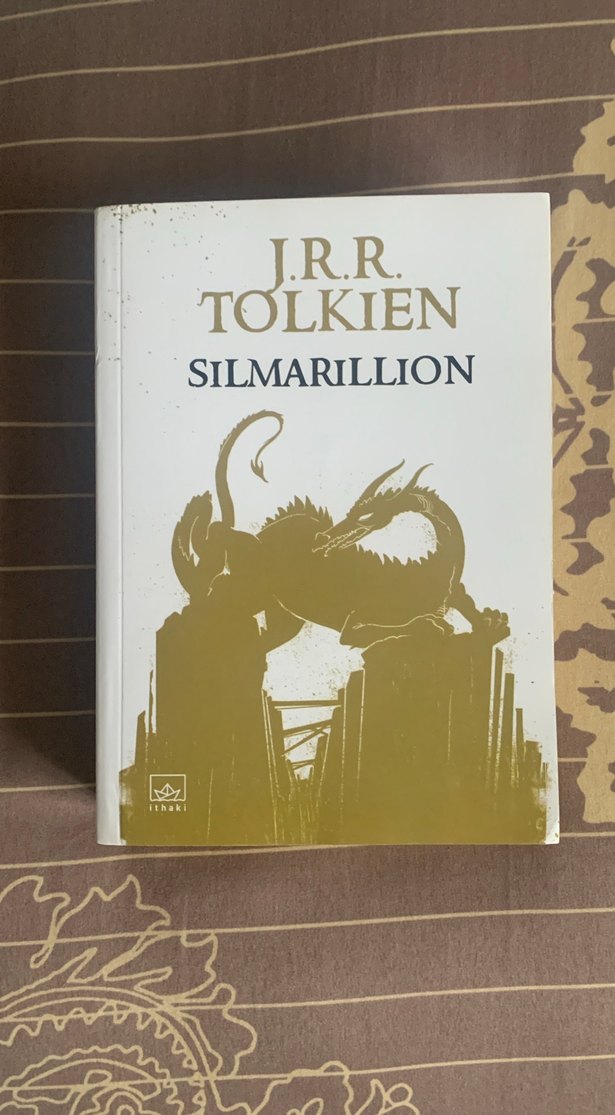 J.R.R. Tolkien'un Silmarillion kitabı, kapakta efsanevi bir ejderha resmiyle. Klasik fantastik edebiyat eseri.