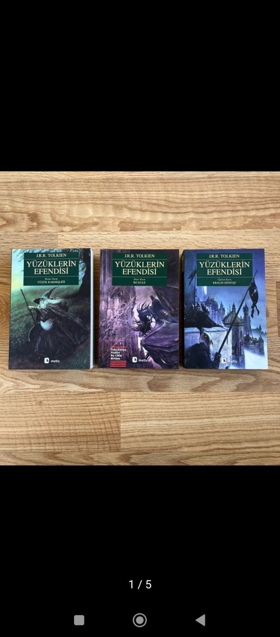 J.R.R. Tolkien'in Yüzüklerin Efendisi serisinden üç kitap, detaylı fantastik kapaklarla birlikte.