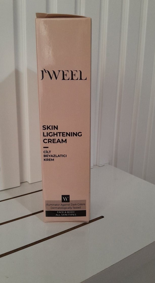 J'WEEL cilt beyazlatıcı krem, yüz ve vücut için tüm cilt tiplerine uygun, dermatolojik olarak test edilmiştir ve koyu lekelerle savaşır.