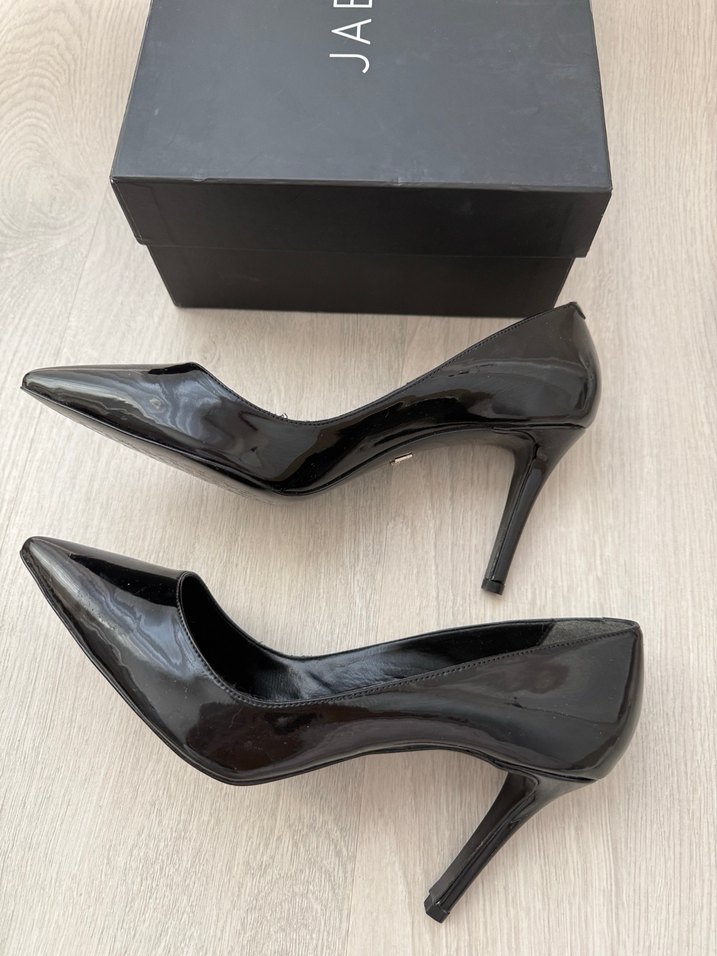 Ofis için uygun, parlak yüzeyli siyah stiletto topuklu, kauçuk malzemeden yapılmış kadın ayakkabısı. 8 cm topuklu hiç kullanılmamış