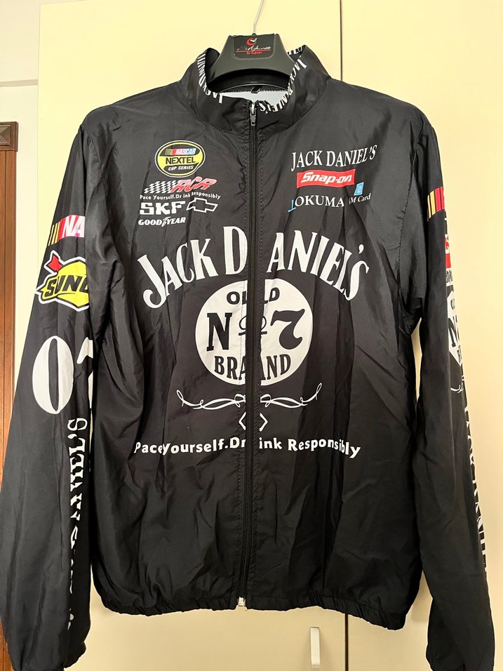 Jack Daniel's baskılı, fermuarlı, uzun kollu, bisikletçi tarzı, siyah erkek yağmurluk. Sentetik kumaştan, normal midi boyda, günlük kullanıma uygun. Trendyoldan almıştım küçük geldiği için ütüleyip göndericem yeni gibi