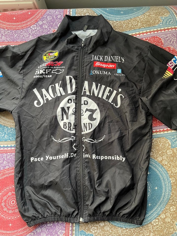 Jack Daniel's logolu siyah biker tarzı erkek rozeti, yarış temalı baskılarla grunge punk havası yansıtıyor. ️