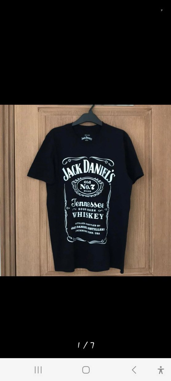 Siyah denim kısa kollu, gevşek kesim ve bisiklet yaka tişört, Jack Daniel's Tennessee Whiskey baskılı rock punk tarzında.