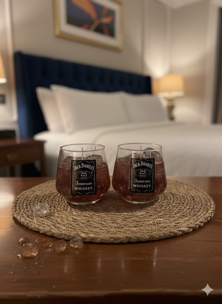 Jack Daniel's Tennessee Whiskey logosu bulunan iki koyu kahverengi viski bardağı mum 2 adet gönderilir