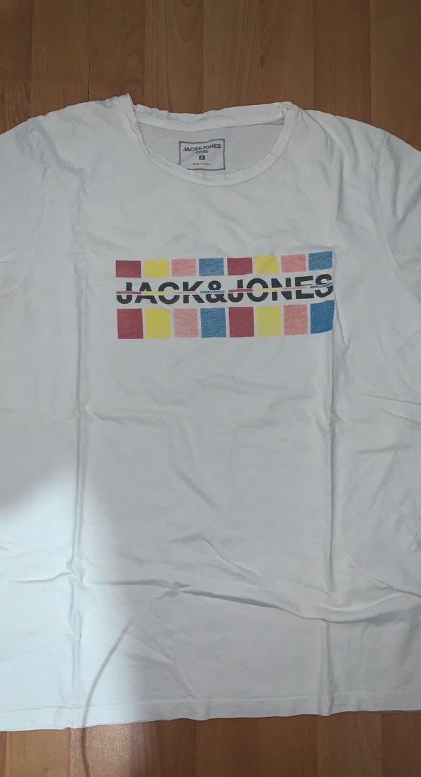 Jack & Jones marka, renkli baskılı beyaz tişört. Pamuklu, kısa kollu, bisiklet yaka ve regular fit yapısıyla günlük rahat stil için uygundur.