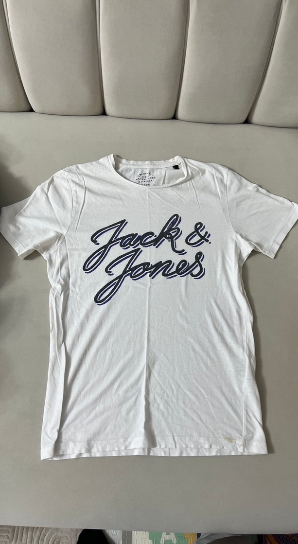 Jack & Jones markalı, pamuklu kumaştan yapılmış, kısa kollu ve yuvarlak yakalı beyaz erkek tişörtü. Önünde baskılı logo bulunur.