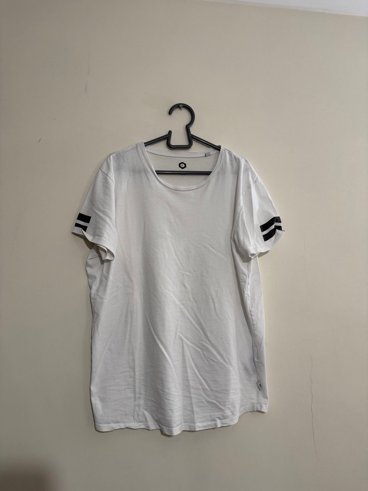 Kollarında siyah çizgi detaylı, kısa kollu beyaz erkek tişört. Pamuklu kumaştan, rahat ve günlük kullanım için uygun. Loose fit modeliyle şık ve rahat.