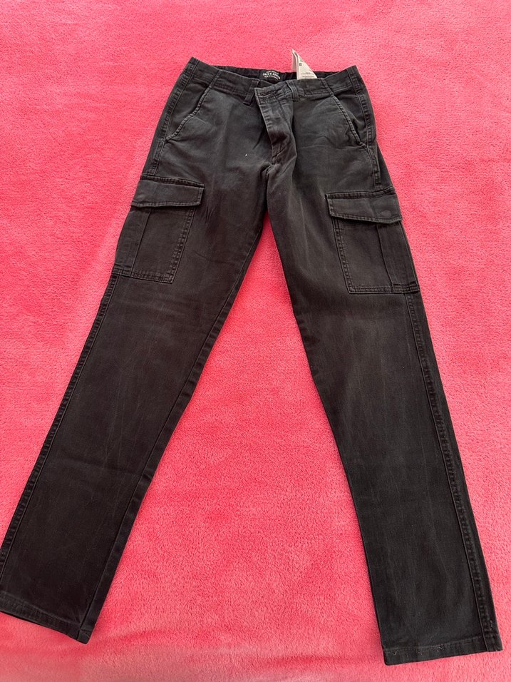 Siyah kot kumaştan, kemerli ve regular fit kesime sahip erkek pantolonu. Streetwear tarzında, outdoor kullanıma uygun.tadilat görmüştür . Arka paçada fotoda göründüğü gibi lekeler vardır