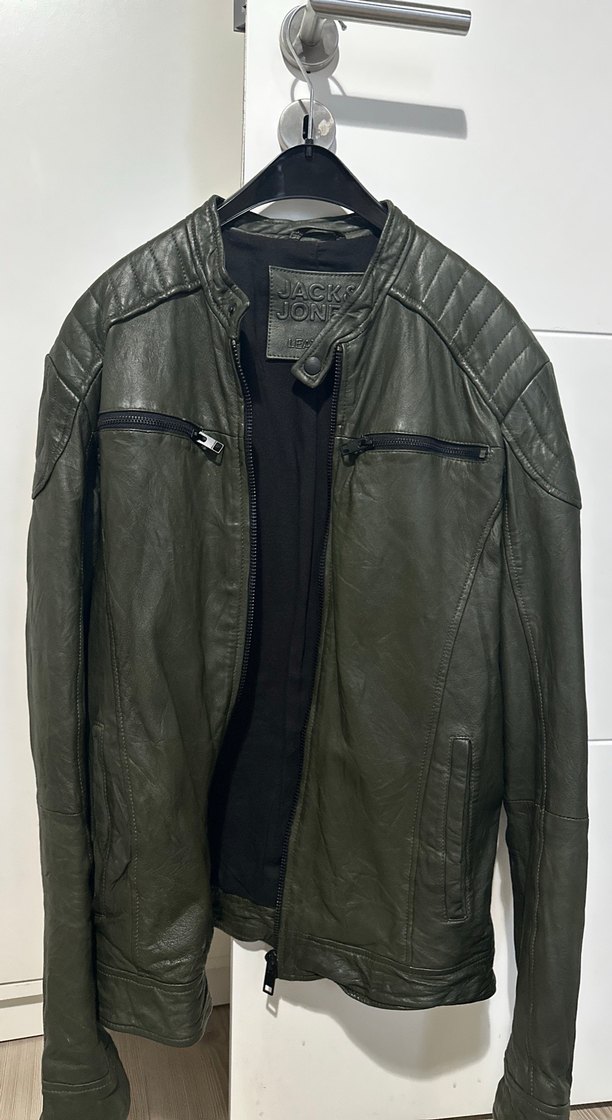Jack & Jones gri deri biker ceket, kesik yaka ve tokalı detaylara sahiptir. Normal kesim, uzun kollu ve fermuarlı ceplerle sokak stiline uygundur.