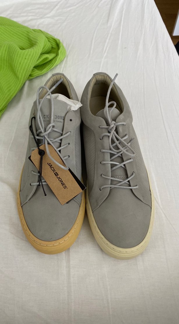 ( Sağ 44 sol 45) Jack & Jones markalı, bağcıklı, gri erkek ayakkabısı. Bej kauçuk tabanlı, günlük kullanıma uygun rahat model.