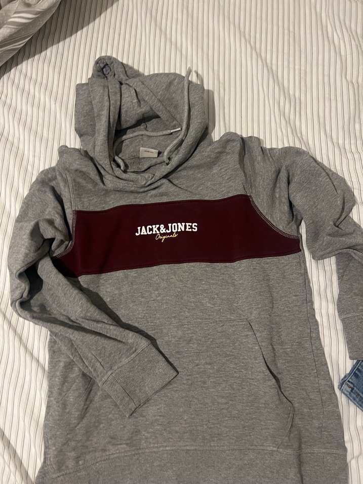 Jack & Jones marka, uzun kollu, kapüşonlu ve fermuarlı, gri renkli sweatshirt. Göğüs kısmında bordo baskı detay bulunur. Rahat ve sıcak kumaştan üretilmiştir.
