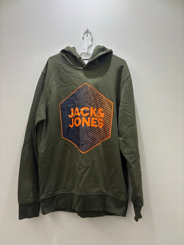 Jack & Jones markalı, kapüşonlu, uzun kollu, bol kesim yeşil sweatshirt. Yumuşak kumaştan yapılmış, önde baskılı logo detay içerir. Spor ve günlük rahat stil için uygundur.