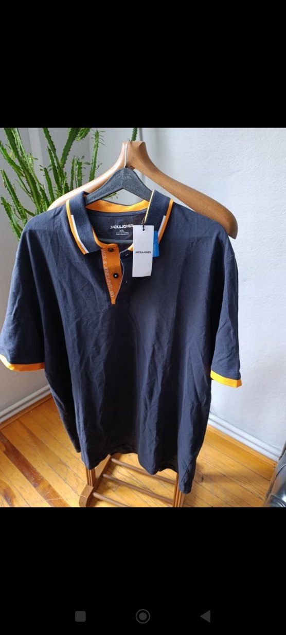 Lacivert renkte, düğmeli polo yakalı ve kısa kollu erkek tişörtü. Pamuklu kumaştan, rahat ve bol kesim, sokak tarzına uygun. Yaka ve kollarda turuncu detaylar bulunur.