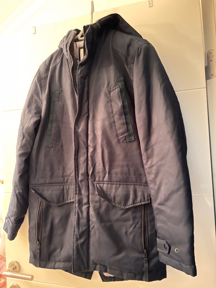Bu lacivert erkek ceketi, kesik yaka ve fermuarlı ceplere sahiptir. Normal kesim, uzun kollu ve midi boyda, yumuşak ve sıcak kumaştan üretilmiştir. Sokak stili ve günlük kullanım için uygundur.