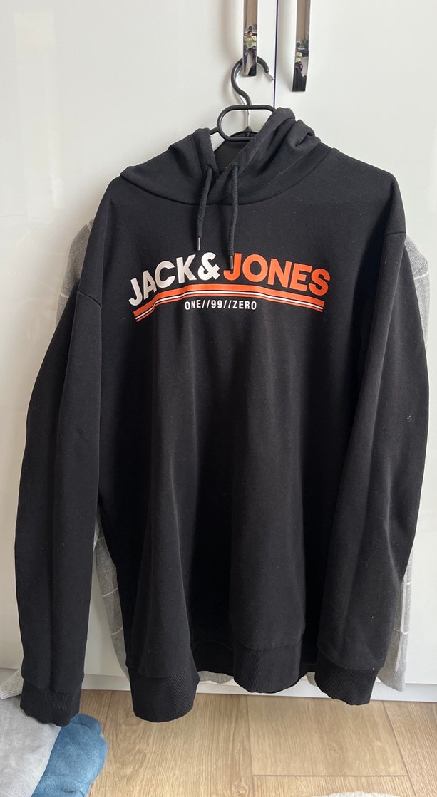 Jack & Jones marka, kapüşonlu, uzun kollu, bol kesim sweatshirt. Siyah renkte, baskılı logo ve fermuarlı detaylara sahip, yumuşak ve sıcak kumaştan üretilmiştir. Önünde "ONE//99//ZERO" yazısı bulunur.