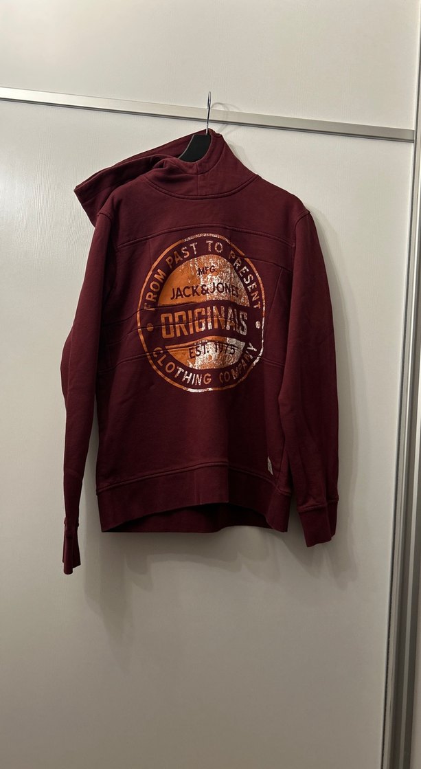 Jack & Jones marka bordo renkli, baskılı sweatshirt. Uzun kollu, yuvarlak yaka, yumuşak kumaştan, günlük kullanım için uygun. Kullanılmıştır kapuşon ipi yok maalesef makul üründür ölçüleri boy 65 cm ikikolaltı arası 52 cm kesim dardır ölçüleri dikkate alarak satın alın