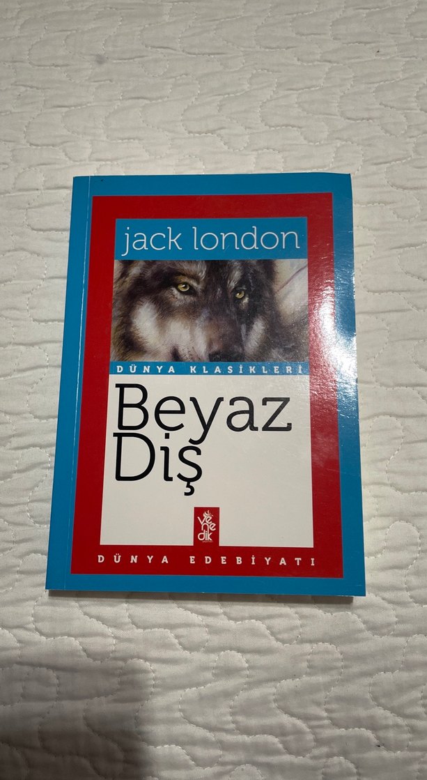 Jack London'un Beyaz Diş romanı, Dünya Klasikleri serisinden. Kapakta kurt görseli bulunur. Dünya edebiyatından önemli bir eserdir.