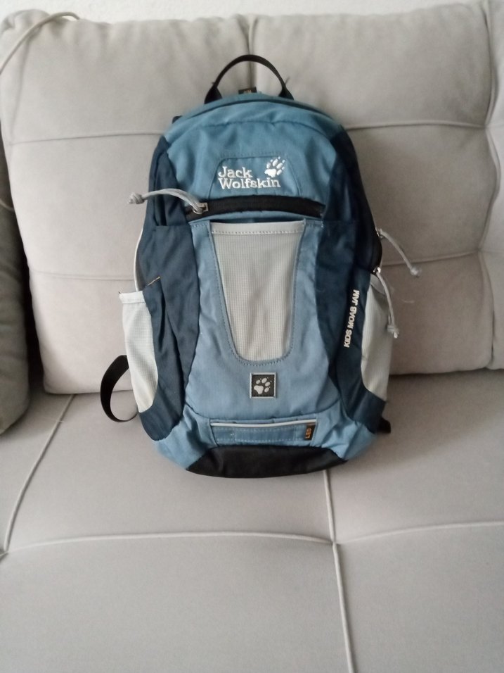 Jack Wolfskin marka, mavi ve gri tonlarında baskılı, tokalı çok bölmeli çocuk spor sırt çantası.
