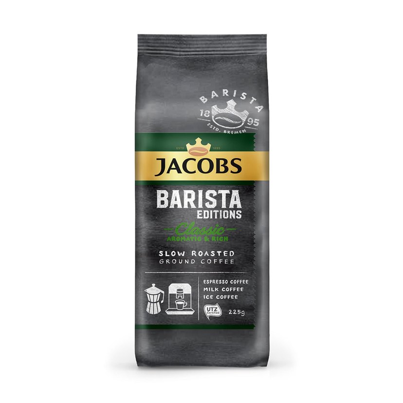 Jacobs Barista Editions Classic yavaş kavrulmuş öğütülmüş kahve. Espresso, sütlü ve buzlu kahve için uygundur. Paket ağırlığı: 225g. ☕