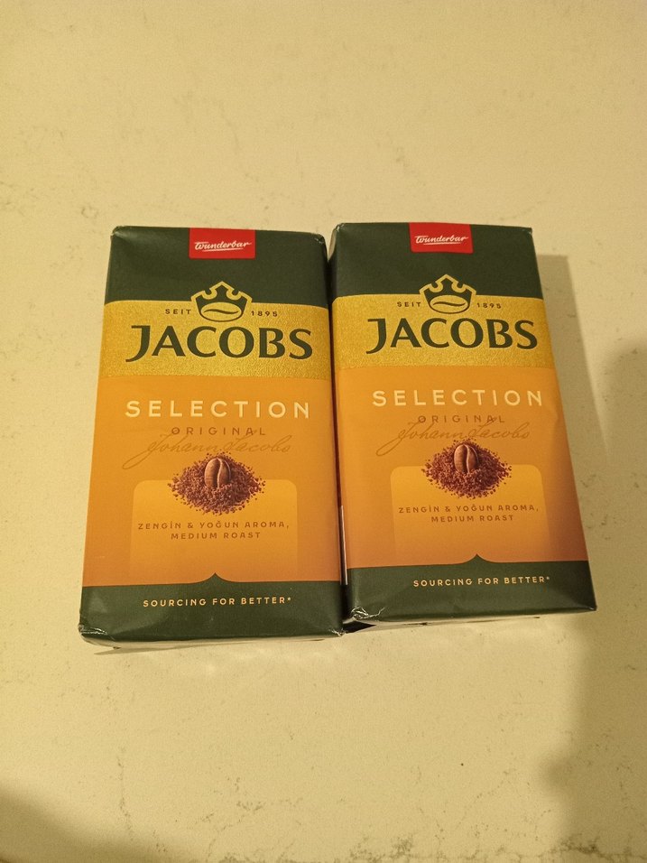 Jacobs Selection Orijinal kahvesi, orta kavrulmuş, zengin ve yoğun aromaya sahiptir. Ambalajda marka ve ürün bilgileri yer alır. ☕