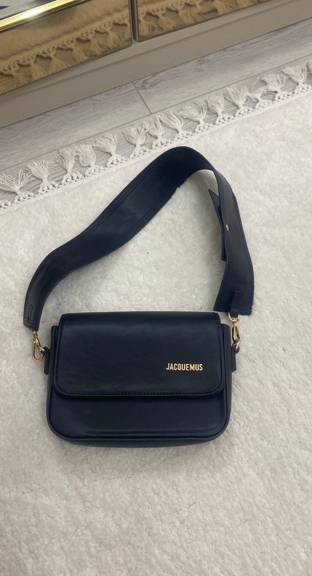Jacquemus markalı siyah deri kadın çantası, tokalı askıya sahip ve desensiz, düz yüzeyiyle günlük kullanıma uygundur.
