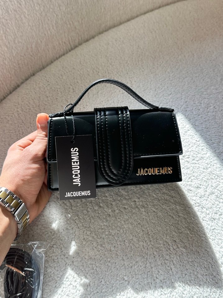 Jacquemus markalı siyah deri kadın çanta, tokalı ve baskılı detaylarla günlük sokak stiline uygun şık bir seçim.