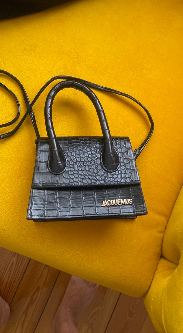 Jacquemus marka siyah deri, yılan desenli, tokalı kadın çantası. Cesur sokak stili için romantik geceye uygun.