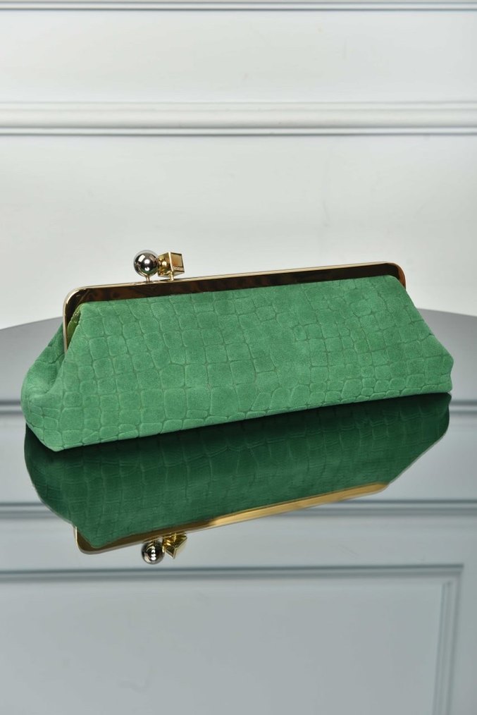 Kadınlar için yeşil parlak yılan desenli süet portföy, tokalı metal çerçeve ile modern klasik tarz sunar. JACQUEMUS - The Salon Clutch İthal Ürün Ölçüler: 32 × 25 × 16 cm