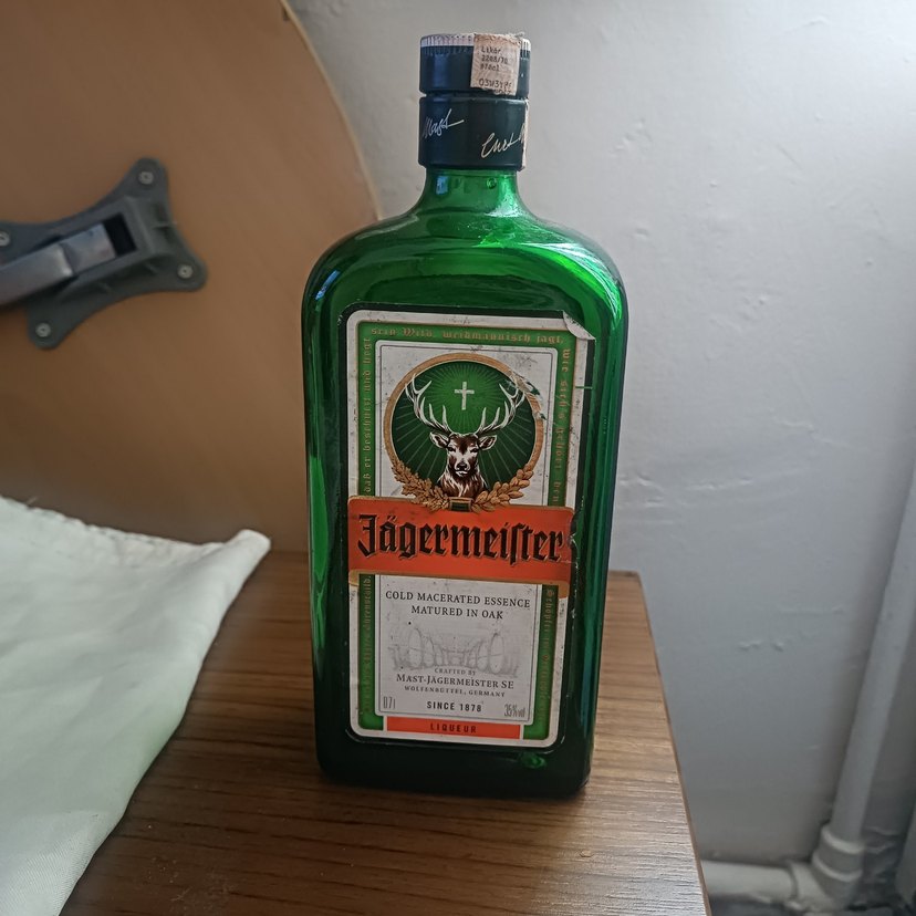 Boş şişedir Soğuk macerasyonla elde edilmiş, meşe fıçısında olgunlaştırılmış esans içeren koyu yeşil vintage Jägermeister şişesi. Etiketinde haçlı geyik figürü bulunur.