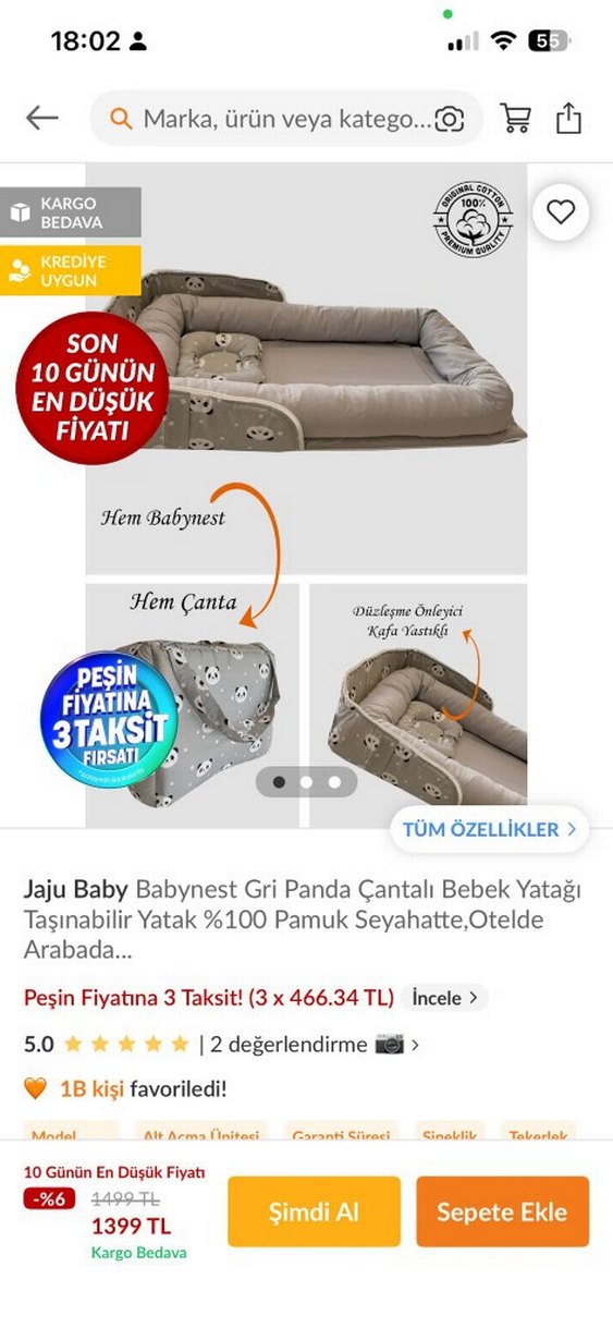 Jaju Baby Babynest, %100 pamuk gri panda desenli taşınabilir bebek yatağıdır. Düzleşmeyi önleyici kafa yastığı ve çanta olarak kullanılabilme özelliği vardır.