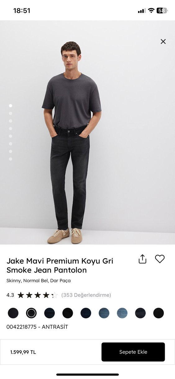 Jake Mavi Premium koyu gri renkli, normal bel ve dar paçalı, kot denim kumaştan yapılmış skinny kesim pantolon.